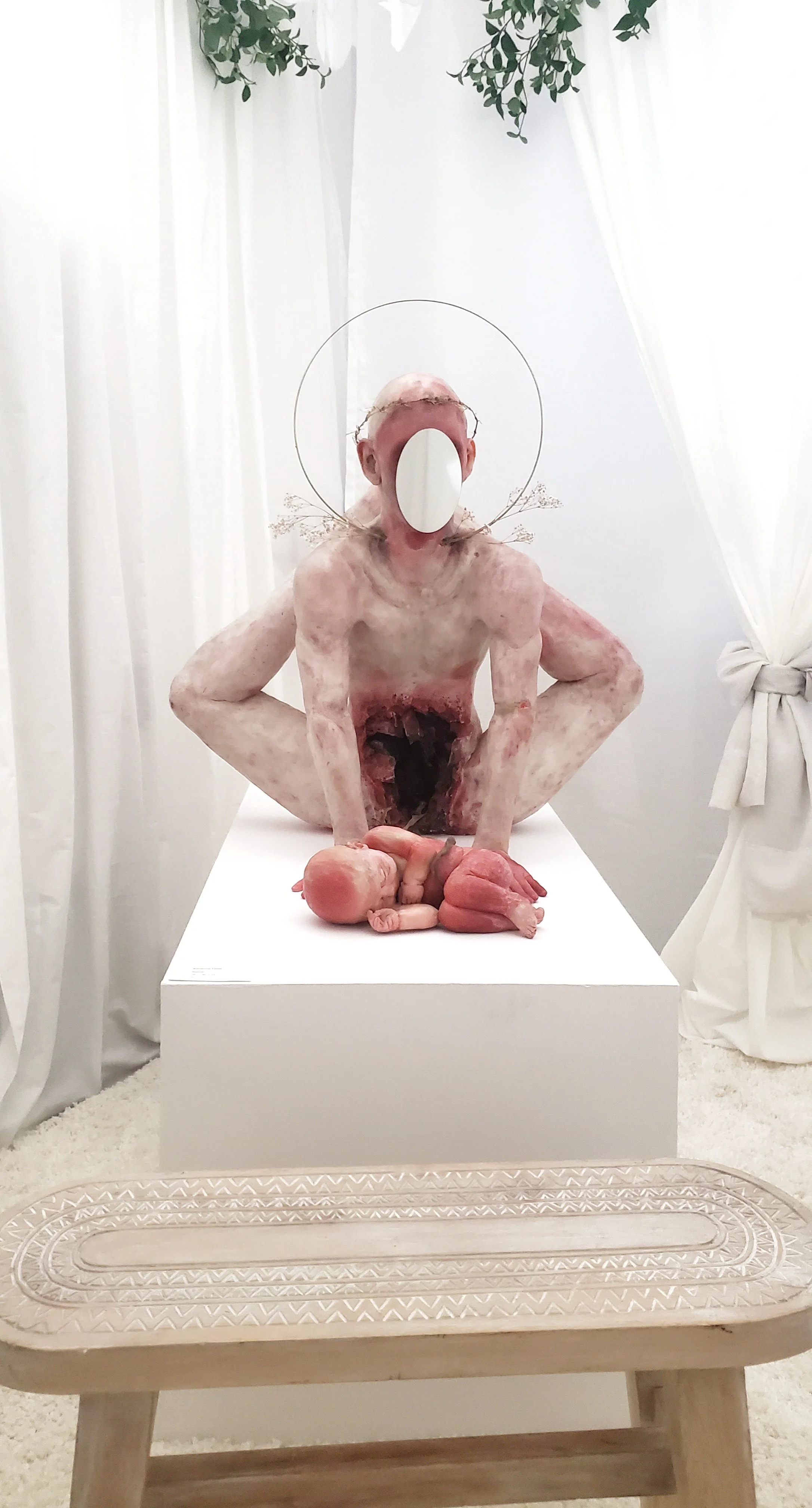 There are over 10 materials present in the work, each material and method its own ingredient and energetic signature. An example: The child was first carved with power tools in wood. Lastly painted delicately in a 3-Dimensional painting process that Adrienne created in wax.